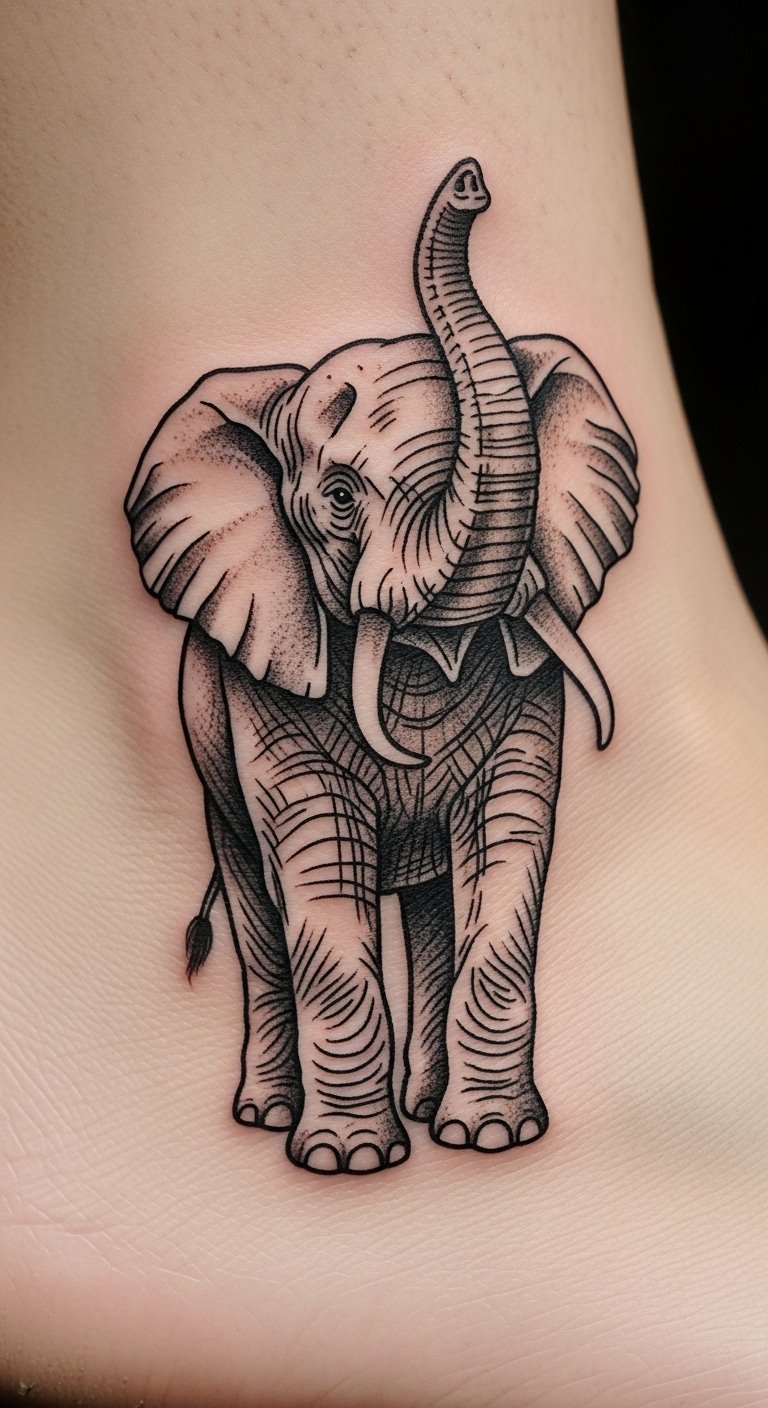 Think simple lines that say a lot. A minimalist elephant outline fits small spaces like your wrist. It’s easy to hide or show off. Start by sketching ideas on paper with a basic pen. This DIY step helps you tweak the design before visiting a studio. For budget tips, look for artists offering flash tattoos under 1 million VND. They use fewer colors, keeping costs low. Pair it with daily wear like bracelets to test visibility. Choose a spot that flows with your movements. This style symbolizes wisdom without overwhelming your skin. Try drawing it yourself for fun practice. You’ll feel more confident when you book. Go for fine-line work to avoid pain. It’s a quick session, often done in under an hour. Make it personal by adding a tiny detail, like a raised trunk for luck.