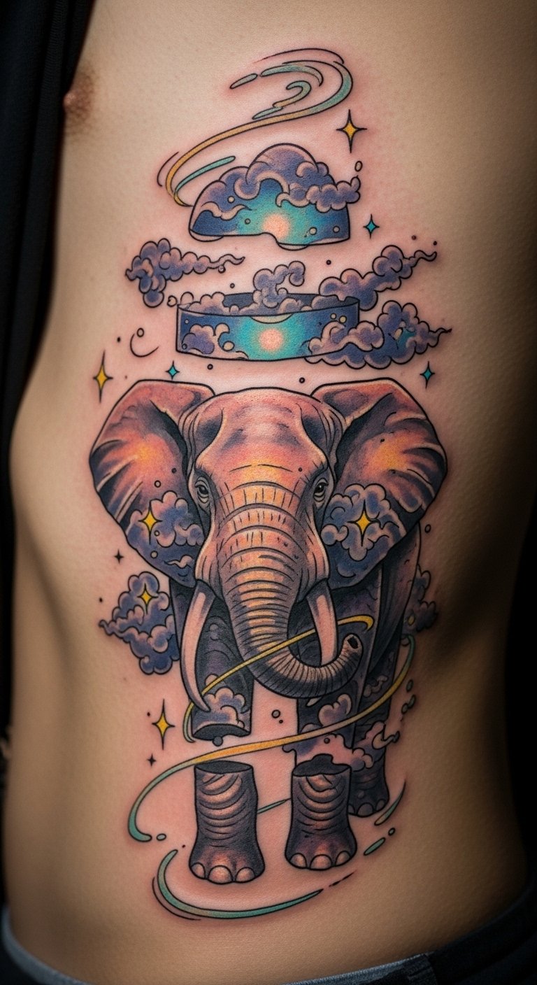 Surreal elephants on your side explore dreams. They blend reality with fantasy. Sketch abstract ideas at home. This DIY fuels creativity. Budget for unique art at 4 million VND. Position for side flow. Add floating motifs. This tattoo represents innovation. Plan phased sessions. Use sketches to align. It’s accessible and inspiring. Preview with imagination.