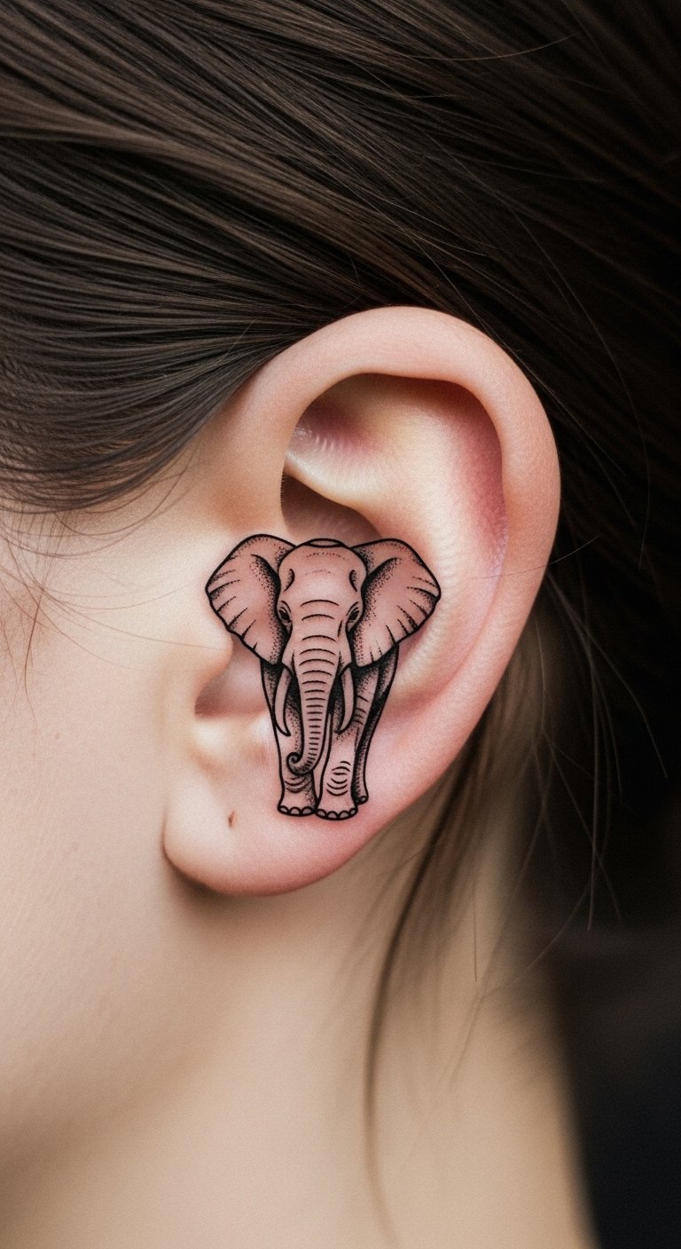 Small elephants behind your ear are discreet and cute. They’re perfect for first tries. Draw mini versions on paper. This DIY prepares you. Go for tiny spots at under 500,000 VND. Place for ear curve. Keep it simple for meaning. This tattoo adds subtle strength. Fast sessions help. Share ideas quickly. It’s affordable and easy. Test with ear sketches.