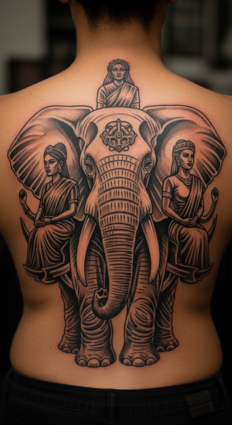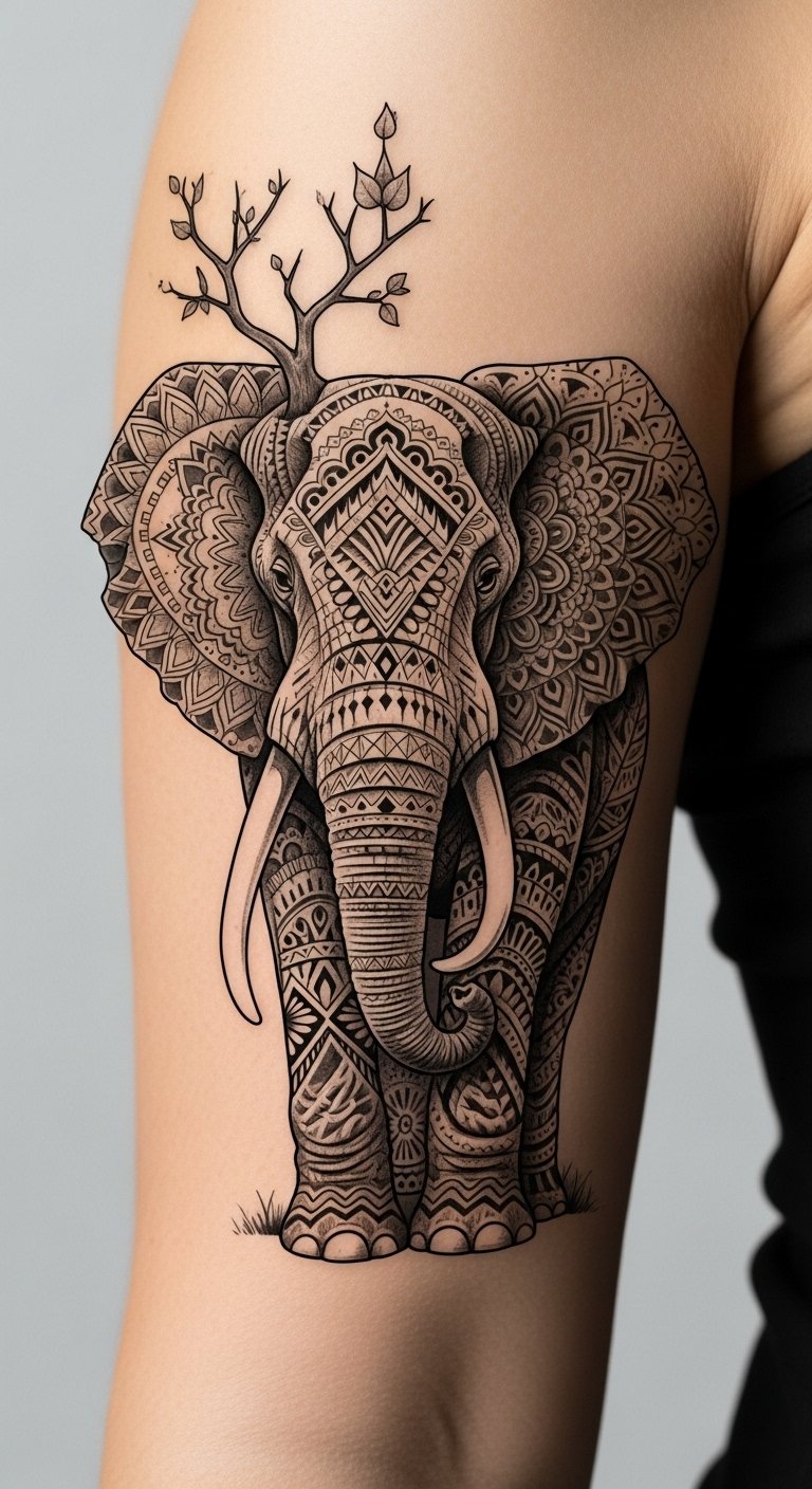 Mandalas around elephants on your upper back offer symmetry and calm. They represent balance. Try drawing circular designs at home. This DIY refines your idea. Look for package rates around 4 million VND. Center it for aesthetic flow. Add personal touches for meaning. This tattoo stands for wisdom and peace. Space out appointments. Bring your drawings to save time. It’s budget-friendly and straightforward. Check with temporary options first.