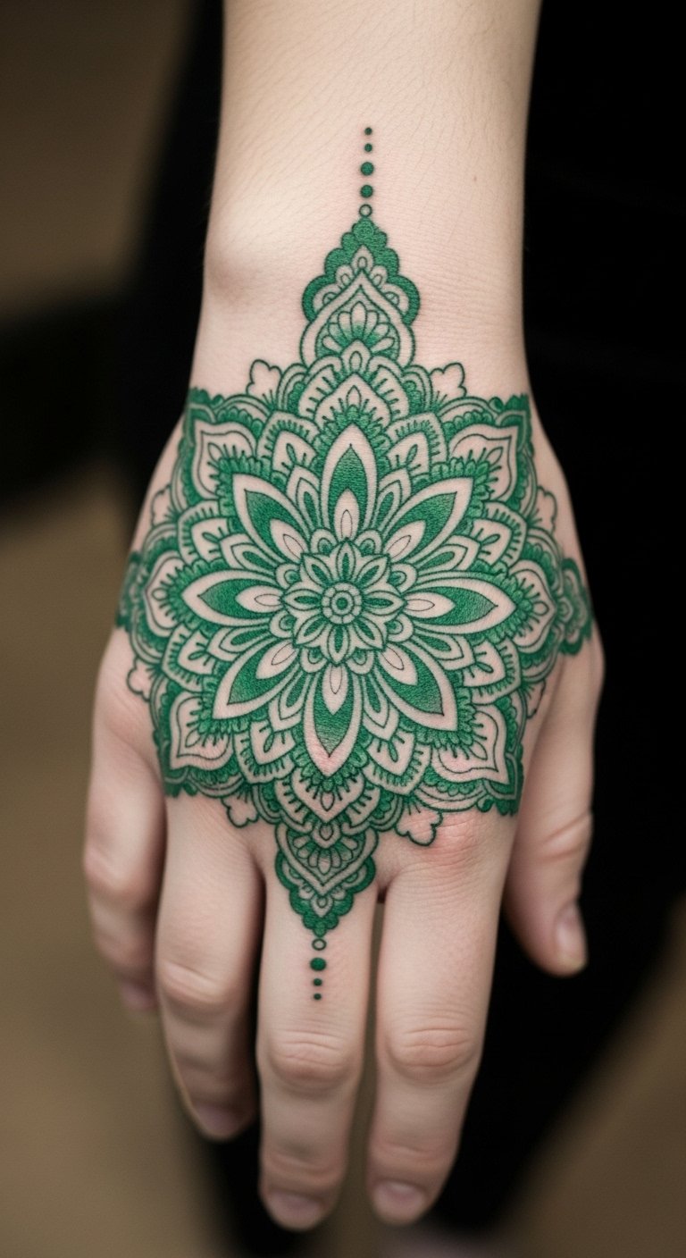 An emerald mandala design brings calm vibes. Draw circles on a notebook to get started. Put it on your palm for constant sight. Detailed ones cost around $70. Find artists at local events for savings. Make a rub-on version with stickers from home. Focus on basic symmetry to keep it cheap. Keep hands clean with soap right away. Add petals for a personal touch. Schedule in the evening for comfort. Moisturize with basic cream daily. Feel the peace it brings every morning.