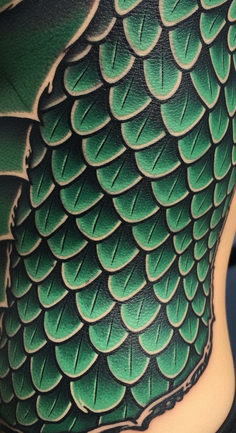 An emerald dragon scale tattoo feels epic. Trace scales on paper for fun. Place on your rib for impact. Scale sets go for $65. Find deals through friend recommendations. Make armor patterns with tape at home. Layer just a few for affordability. Shield with a shirt initially. Include a tail for flair. Aim for a relaxed session. Use coconut oil for maintenance. Embrace the strength it represents.
