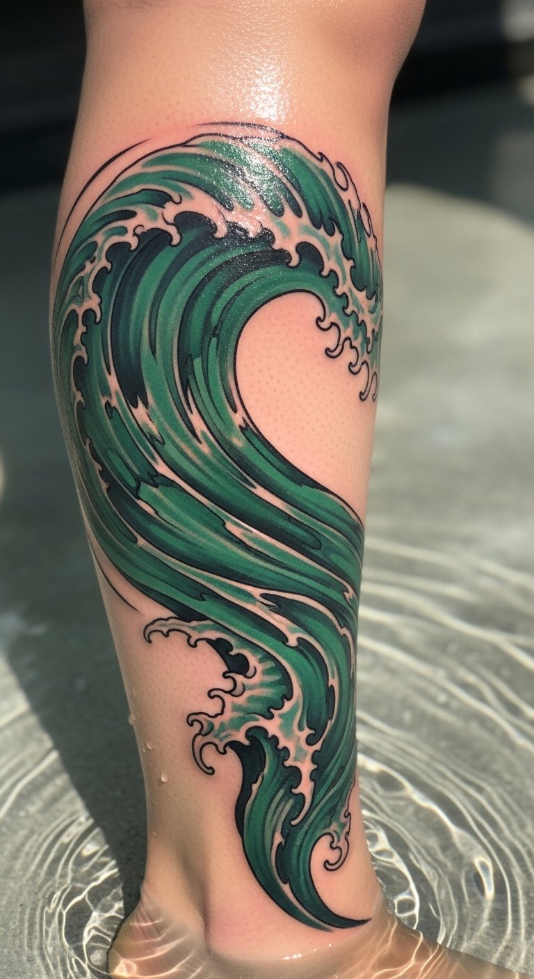 An emerald wave ocean tattoo evokes adventure. Draw waves on beach sand first. Put it on your calf for movement. Wave designs cost $55. Look at coastal shop ads. Simulate with watercolors on paper. Use simple curves to cut expenses. Cover with pants early on. Add foam details for fun. Schedule around your routine. Heal with sea salt scrubs. Ride the wave of inspiration.
