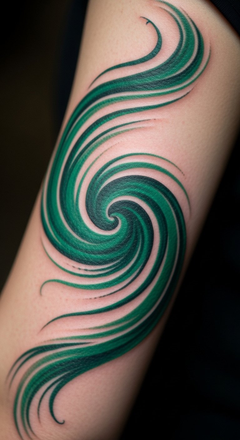 Abstract emerald swirls tattoo offers freedom. Swirl designs on canvas at home. Try your forearm for expression. Swirls start at $60. Look for creative collectives. Mimic with string art yourself. Blend colors simply. Protect with sleeves. Twist in loops for variety. Book flexible times. Soothe with aloe vera. Flow with the design.