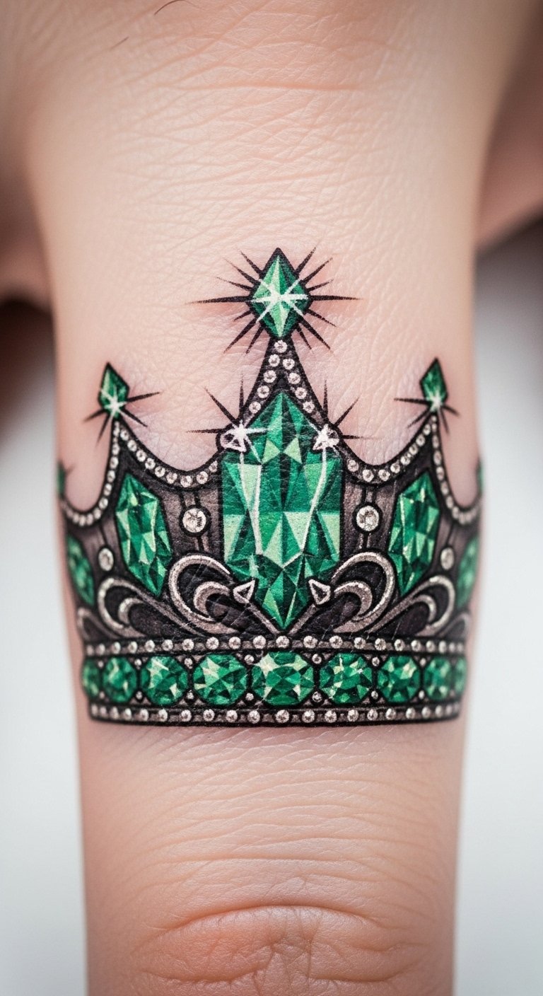 An emerald crown jewel tattoo feels royal. Draw a crown on jewelry. Place on your finger for flair. Jewel designs are $50. Look for gem-themed pros. Use beads for mockups. Focus on the top. Guard with rings. Embed stones virtually. Quick and easy. Treat with oil. Wear your crown proud.