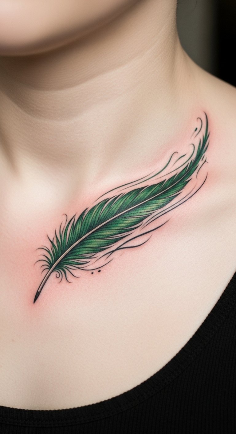 An emerald feather drift tattoo adds lightness. Feather on paper with ease. Drift on your collarbone. Feathers go for $55. Find airy artist profiles. Simulate with real feathers. Keep it floating. Cover lightly. Include wind lines. Schedule smoothly. Care with soft cloths. Drift into serenity.