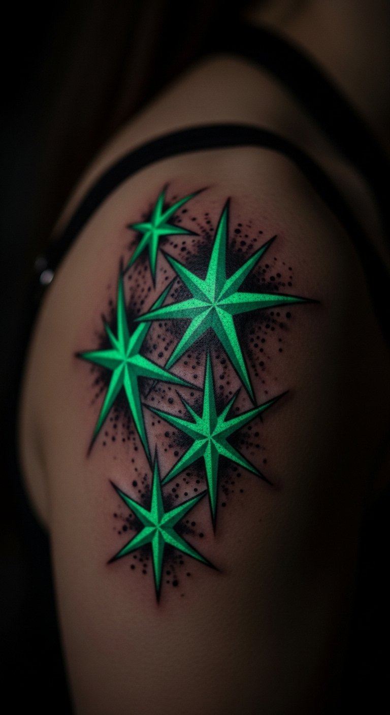 An emerald star cluster tattoo lights up nights. Dot stars on a map. Cluster on your shoulder. Stars cost $65. Search sky-watching groups. Use star stickers. Group a few. Protect from light. Add constellations. Time your visit. Heal under stars. Shine bright.
