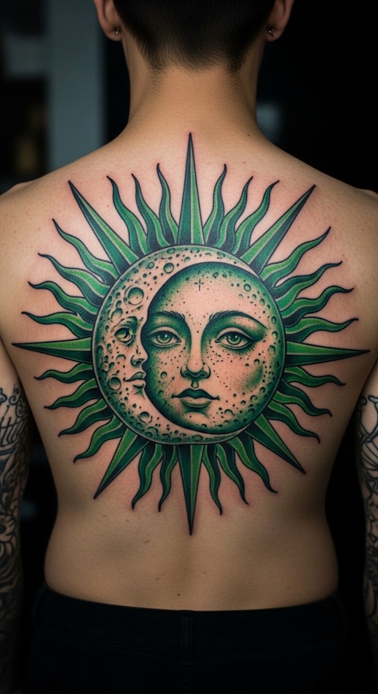 An emerald sun and moon tattoo balances day and night. Draw both on paper. Position on your back. Pairs cost $70. Find cosmic creators. Use dual stamps. Pair simply. Cover as needed. Include phases. Split sessions. Care daily. Balance your world.
