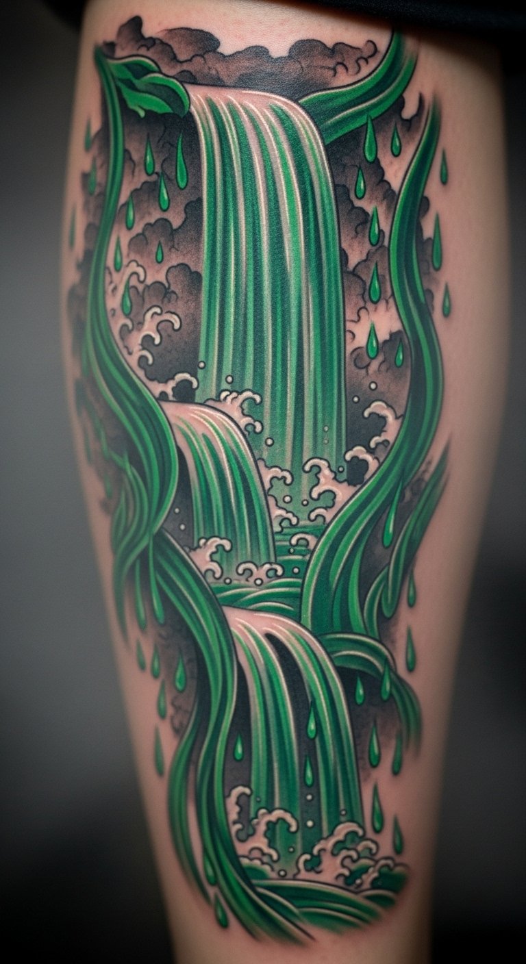 An emerald waterfall cascade tattoo refreshes you. Cascade water drawings. Flow on your leg. Cascades are $55. Search nature spots. Mimic with water. Keep it streaming. Protect from wet. Add rocks. Time it right. Heal with water. Cascade into peace.
