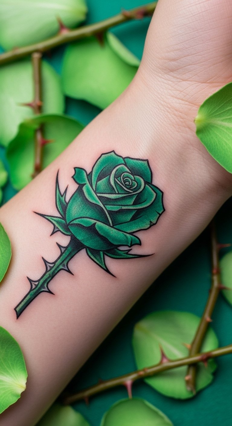 An emerald rose thorn tattoo shows beauty with edge. Thorn on a rose sketch. Place on your wrist. Roses cost $50. Find flower fans. Use petal cutouts. Add thorns carefully. Cover initially. Include stems. Book fast. Treat gently. Bloom strong.
