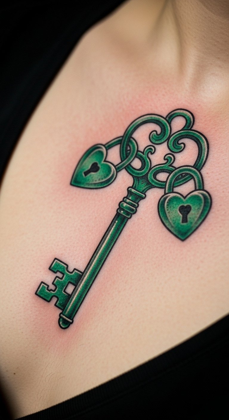 An emerald key to heart tattoo unlocks feelings. Key a heart drawing. Lock on your chest. Keys cost $65. Search heart motifs. Use key charms. Keep it locked. Protect close. Add chains. Schedule heartfully. Heal with love. Open your heart.