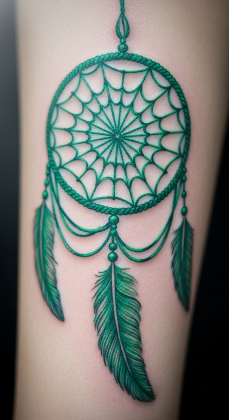 An emerald dreamcatcher web tattoo catches good dreams. Web a catcher design. Catch on your arm. Catchers are $60. Find dream artists. Use web strings. Catch simply. Cover nightly. Add feathers. Book dreams. Care softly. Dream on.