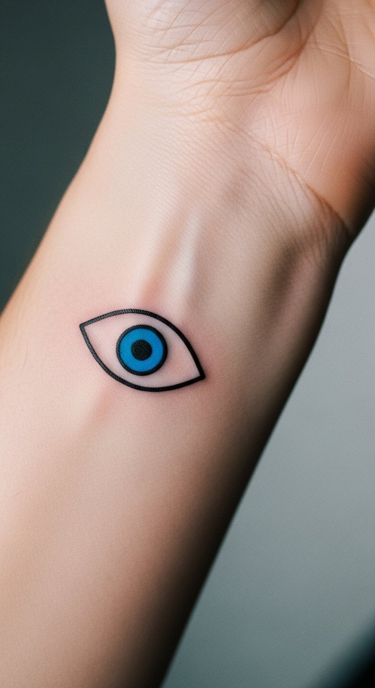 A minimalist blue evil eye tattoo keeps things simple yet powerful. Think of it as your daily guard against bad vibes. This design uses a basic blue circle to represent protection. Place it on your wrist for easy visibility and a constant reminder. For a budget option, sketch the idea on paper first with markers to test the look. If you’re DIY curious, use temporary tattoo kits from the drugstore—apply one and wear it for a week to see if it fits. Pair this with everyday jewelry like a simple bracelet to enhance the effect. Bold colors like blue stand out without overwhelming your style. Keep it small to save on tattoo costs, often under $50 for a basic session. This approach lets you add protection without a big commitment.