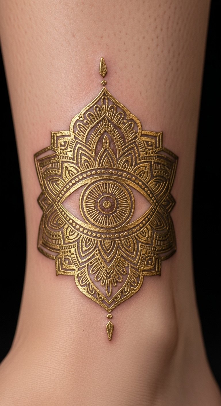 An ornate gold evil eye on the ankle adds a touch of luxury to your protection game. Gold means health and power, making this tattoo a stylish ally for your steps. Put it low on the ankle to keep it personal and close to the ground. For affordable ideas, look for gold temporary tattoos online—they cost pennies and let you try the feel first. If you’re handy, use body paint from the dollar store to mimic the design temporarily. Mix it with daily routines, like glancing at it during walks for a confidence lift. Opt for a smaller size to keep costs down, often less than $70. This design blends fashion with function, turning your ankle into a subtle guardian.