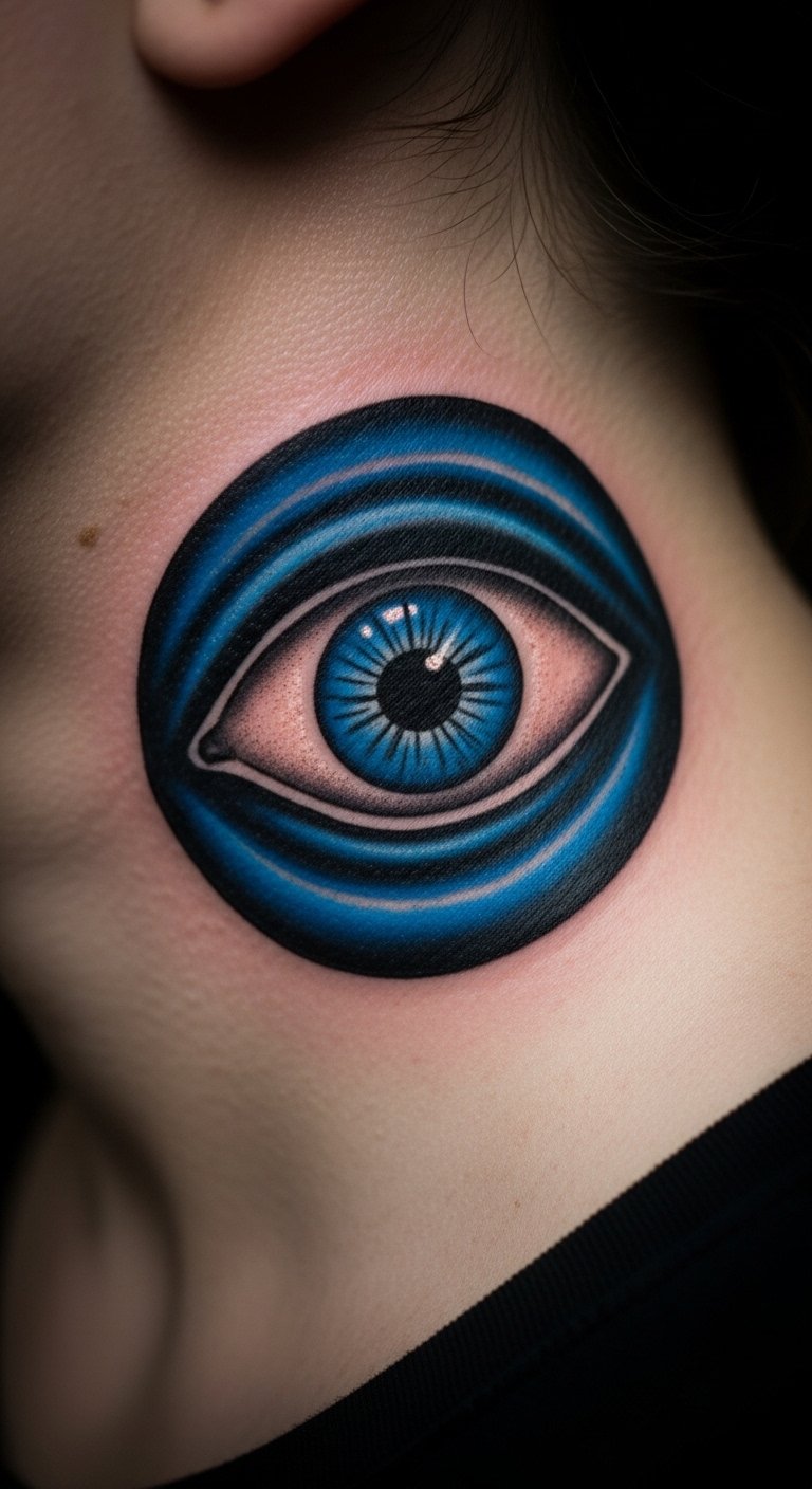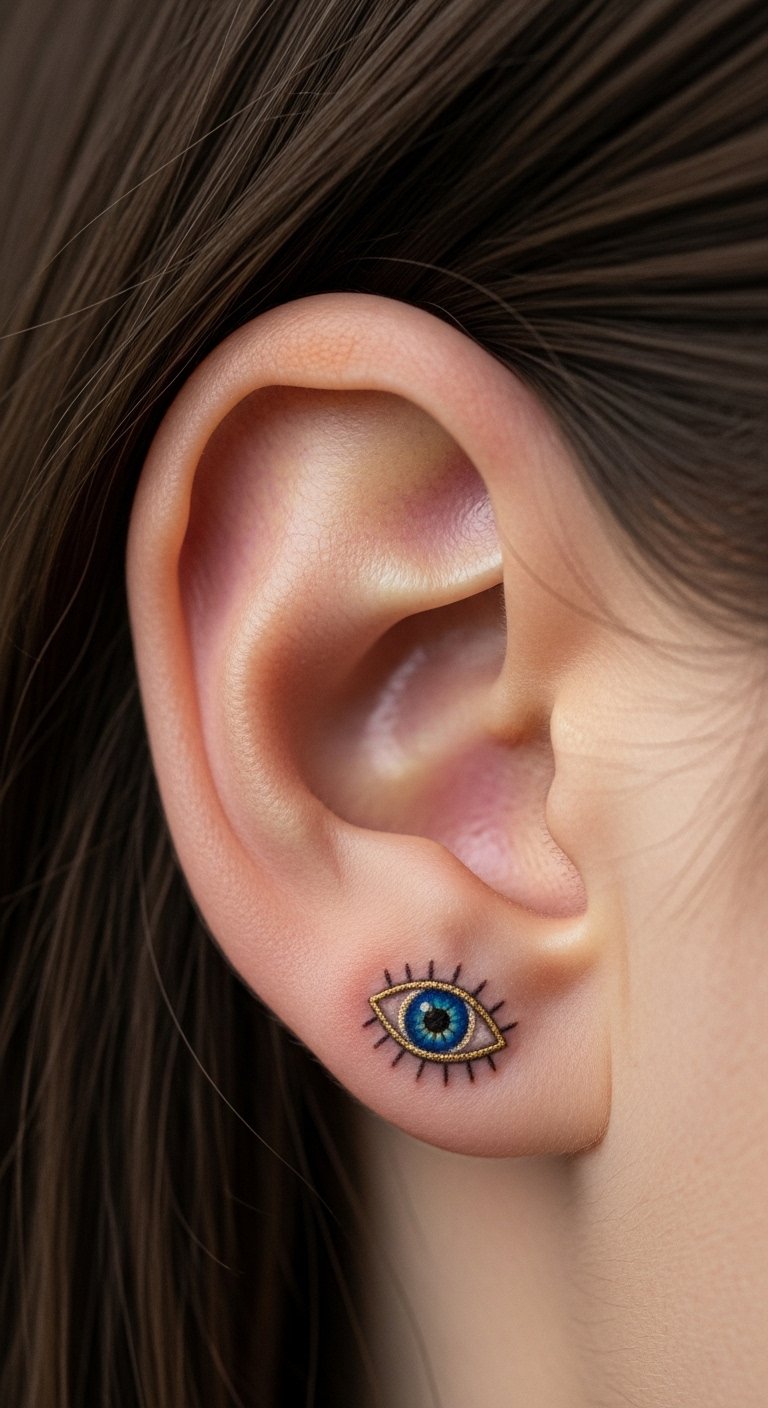 A subtle evil eye behind the ear offers discreet protection that stays close to your thoughts. This spot makes the tattoo a secret helper against envy. Choose blue for its classic guard vibe. Search for inexpensive artists in community forums to cut costs. Practice with ear-friendly stickers from online shops—they’re cheap and reusable for trials. Incorporate it into your morning routine, like touching it for a focus boost. Go small to keep expenses low, typically under $40. This design serves as a quiet reminder to stay aware and positive throughout the day.