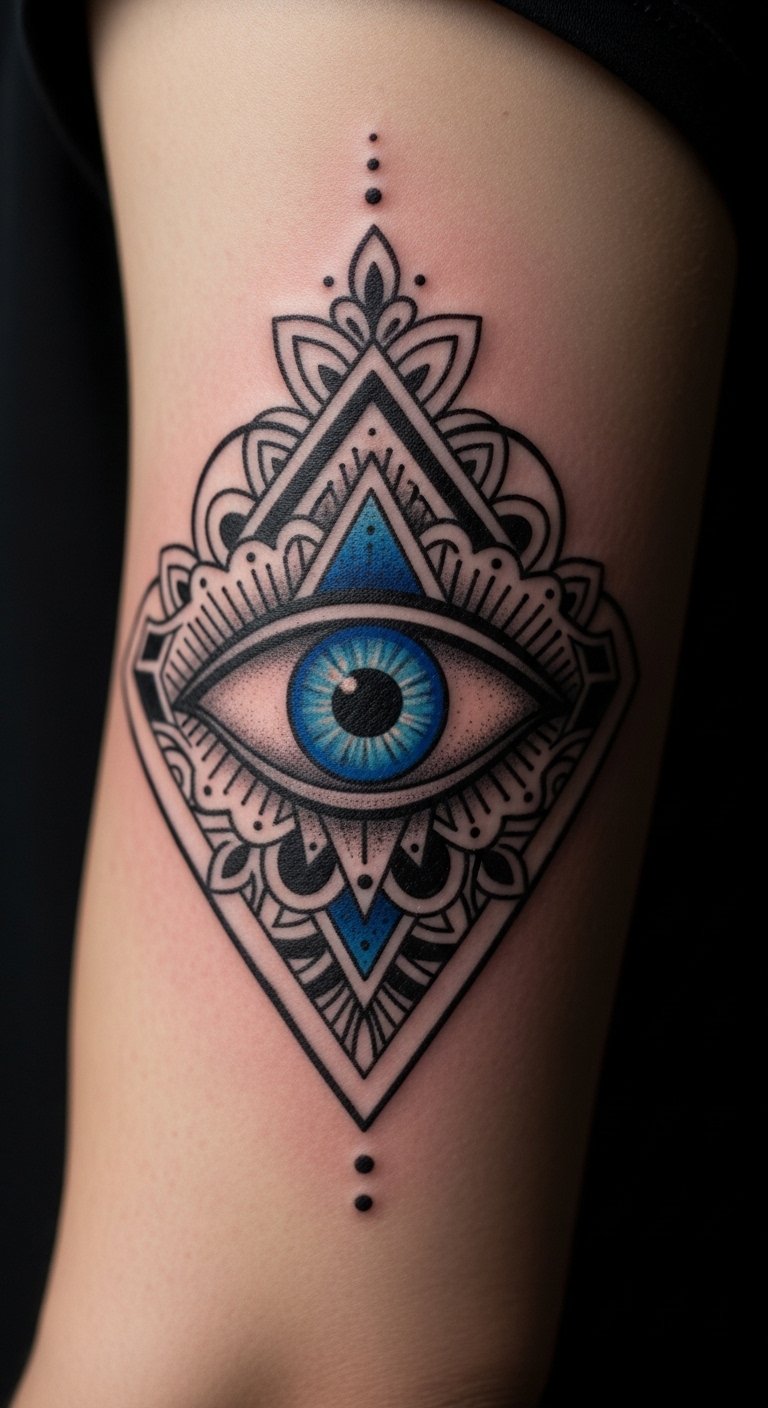 Evil eye with geometric patterns on the arm merges modern shapes with ancient protection. Patterns add strength, turning the tattoo into a layered defense. Site it on your arm for easy views during activities. Look for deals on tattoo flash days at local shops to save money. Test ideas with geometric stencils and markers at home for a DIY preview. Use it as a prompt for reflection, like tracing the shapes for calm. Opt for simple versions to stay within $50. This combination brings a fresh twist to warding off negativity.