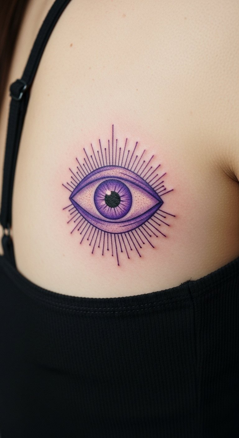A purple evil eye for balance on the rib creates a harmonious spot for inner peace. Purple stands for stability, helping you maintain good vibes amid chaos. Position it on the rib for a personal, intimate feel. Find affordable options through app-based tattoo finders. Try purple temporary tattoos from beauty stores to experiment first. Pair it with breathing exercises for a quick balance check. Keep it streamlined to hold costs at around $60. This design supports your quest for daily equilibrium.