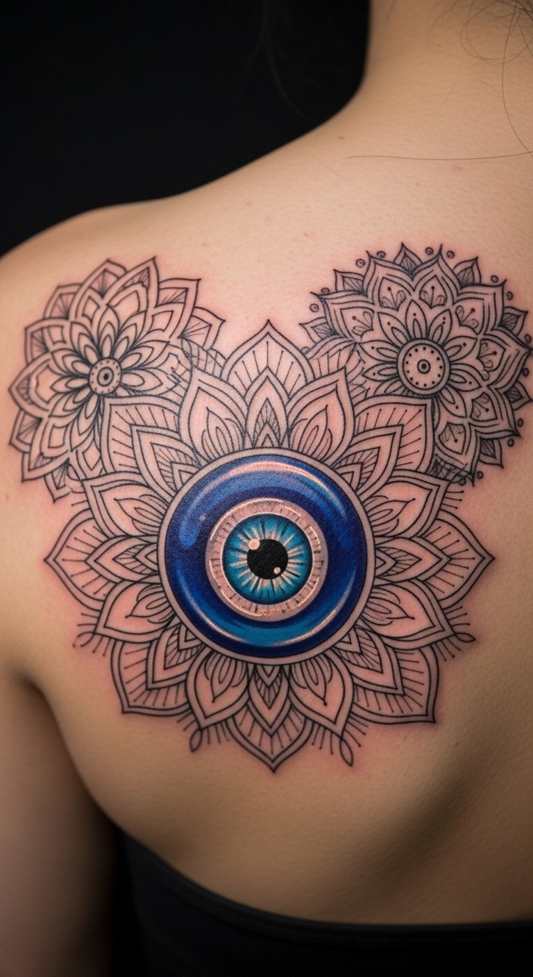 Evil eye combined with mandala on the shoulder boosts protection with spiritual circles. The mandala adds depth, making the tattoo a full-circle guardian. Place it on the shoulder for strength during challenges. Check online marketplaces for budget artist collaborations. Sketch mandala ideas with free apps on your phone for home trials. Integrate it into meditation sessions for enhanced focus. Aim for a balanced size to keep fees under $70. This pair offers a creative way to invite positive energy.