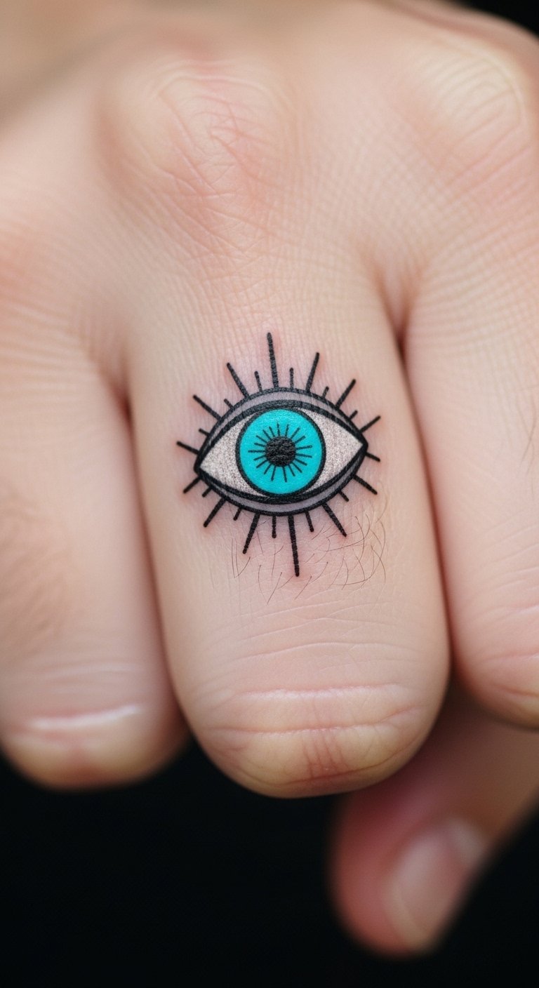 A turquoise evil eye on the finger brings protection to your hands and actions. Turquoise means creativity, turning this tattoo into a muse for ideas. Put it on a finger for constant touch. Search budget tattoo kits for at-home practice options. Use nail art stickers in turquoise to test the design cheaply. Let it guide your creative tasks, like drawing for inspiration. Go tiny to save on costs, around $30. This spot keeps good vibes in reach.