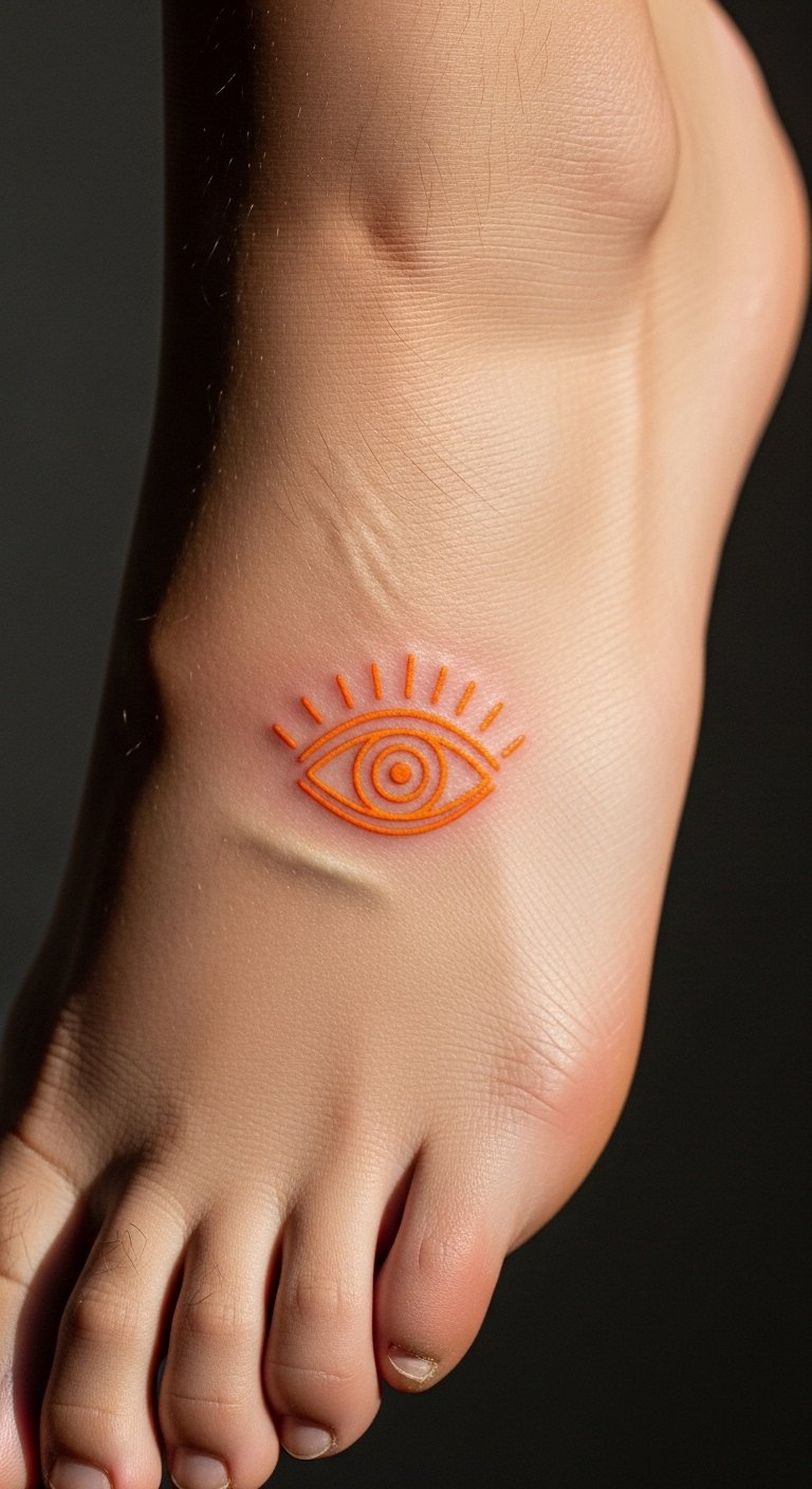 An orange evil eye for creativity on the foot steps up your imaginative side. Orange sparks ideas, making the tattoo a walking boost. Locate it on the foot for grounded energy. Find sales at walk-in studios to cut expenses. Practice with orange body crayons for a quick DIY. Use it during walks to spark thoughts. Keep it small for under $50. This design fuels your daily creativity.
