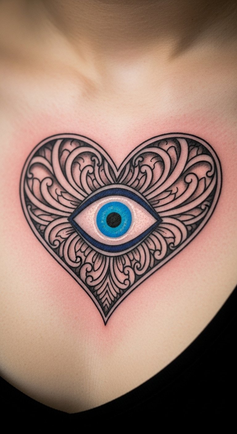 Evil eye in a heart shape on the chest links protection with love. This design guards your emotions and relationships. Site it on the chest for heart-centered vibes. Look for group tattoo events for deals. Draw heart shapes with colored pencils at home to plan. Tie it to self-love routines for affirmation. Opt for moderate details to stay at $60. It adds a warm layer to your shield.