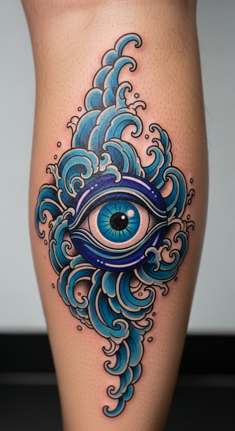 Evil eye with waves on the calf brings fluid protection to your path. Waves symbolize flow, aiding adaptability. Put it on the calf for mobility. Find wave-inspired designs in free online resources. Practice with wave stencils and paints at home. Let it guide your flexible mindset. Aim for flowing lines to cost about $50. This design moves with your energy.