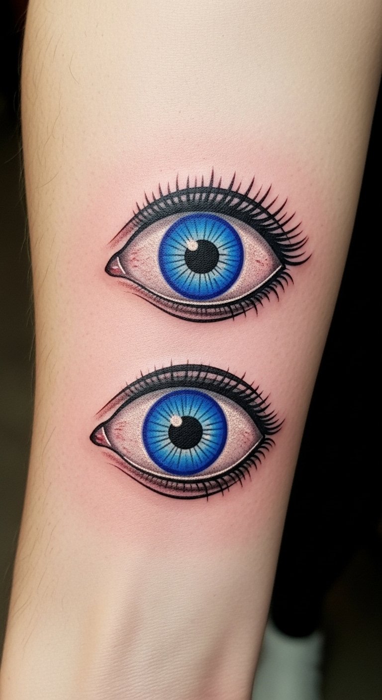 Double evil eye on the forearm doubles your defense against negativity. This pair offers extra layers of good vibes. Position it on the forearm for ready access. Check for buy-one-get-one deals at studios. Duplicate designs with duplicate stencils for DIY tests. Use it for paired affirmations. Keep both small for under $70. It strengthens your protective routine.