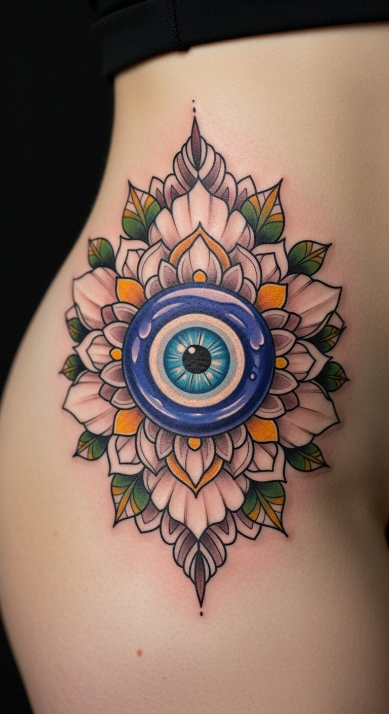 Evil eye in floral design on the hip blends beauty with protection. Flowers add growth, making it a blooming shield. Site it on the hip for personal power. Look for floral templates online for budget planning. Try floral temporary tattoos for trials. Incorporate it into nature walks for inspiration. Go for light details at around $60. This design grows your positive aura.