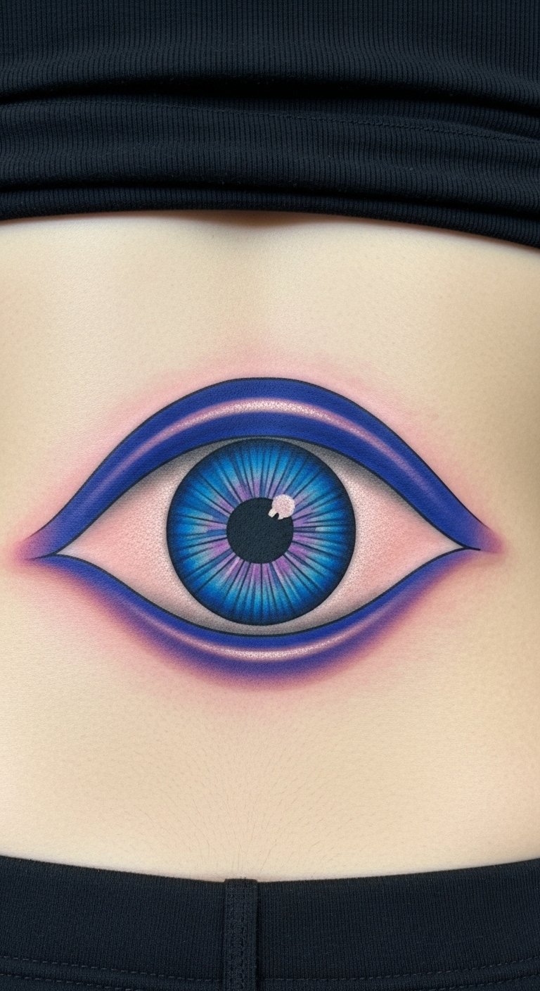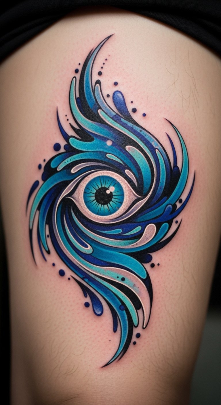 An abstract evil eye on the thigh offers a modern take on guarding your moves. Abstract shapes bring uniqueness to the protection. Place it on the thigh for strength. Find abstract ideas in art apps for free. Experiment with abstract drawings at home. Use it for creative reflection. Keep it fluid for about $50. This style personalizes your vibe.