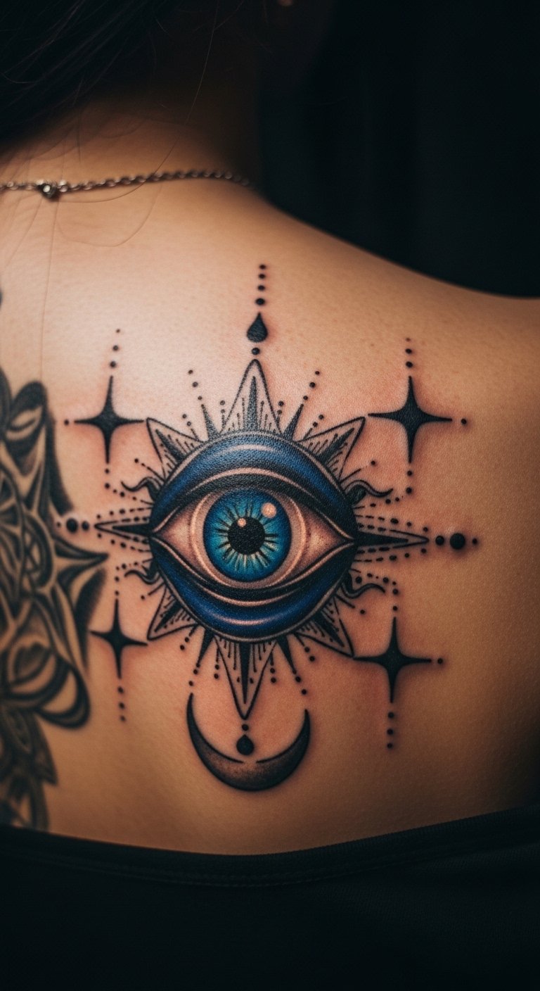 Evil eye with stars on the upper back reaches for cosmic protection. Stars add guidance, turning it into a starry shield. Put it on the upper back for broad coverage. Search for star stencils in craft stores. Practice with star stickers for quick tests. Let it spark nightly reflections. Aim for starry simplicity at $60. It lights up your path.
