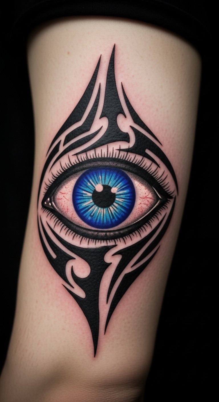 Evil eye in tribal style on the bicep honors roots while providing protection. Tribal lines add resilience to the design. Place it on the bicep for power. Find tribal inspirations in free online galleries. Test with tribal markers for DIY fun. Use it during strength exercises. Go bold but budget-friendly at $50. It builds your inner fortitude.
