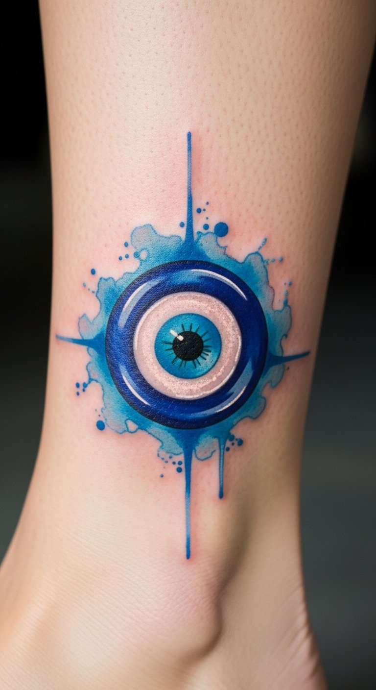 Evil eye in watercolor style on the ankle paints protection with artistry. Watercolor adds a soft, flowing feel. Put it on the ankle for light steps. Find watercolor ideas in art books. Try watercolor markers for home tests. Use it for artistic inspiration. Go for soft shades at $60. It washes your worries away.