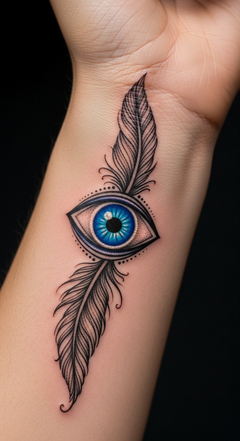 Evil eye with feathers on the wrist lifts protection to new heights. Feathers mean freedom, adding a light touch. Site it on the wrist for daily wear. Search for feather stencils online. Practice with feather drawings. Let it soar with your thoughts. Keep it feathery for under $50. It feathers your guard.
