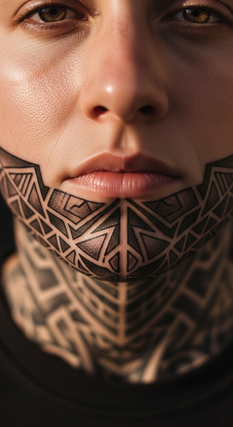A jawline geometric pattern adds structure. It defines your face. Choose shapes that reflect your interests. Start sketching on grid paper. It helps with symmetry. For cheap options, use phone apps with shape tools. They assist in planning. Look for artists with portfolio sites. Many share affordable deals. DIY example: Cut out paper stencils and hold them up. See how they fit. Go for basic designs to save. This tattoo enhances your profile. Wear it with casual outfits. Apply store-bought balms for healing. They keep it vibrant. Clean regularly with mild products. You’ll feel stronger with each glance. Test in different mirrors at home.