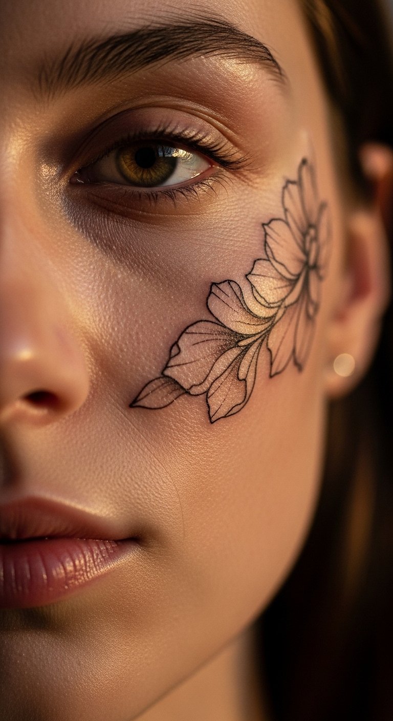 A cheekbone floral motif brings nature to your skin. It softens your features. Pick flowers that inspire you. Draw them roughly on a sketchpad first. This sparks creativity. For money-saving tips, browse public domain art sites. Download and adapt. Contact local shops for free estimates. DIY example: Trace flowers with colored pencils on your face in the mirror. Test the flow. Choose small blooms to cut costs. This tattoo adds charm to your style. Layer with jewelry for impact. Opt for drugstore salves for healing. They preserve the color. Clean with soap and water. You’ll embrace your uniqueness daily. Play with poses for photos.