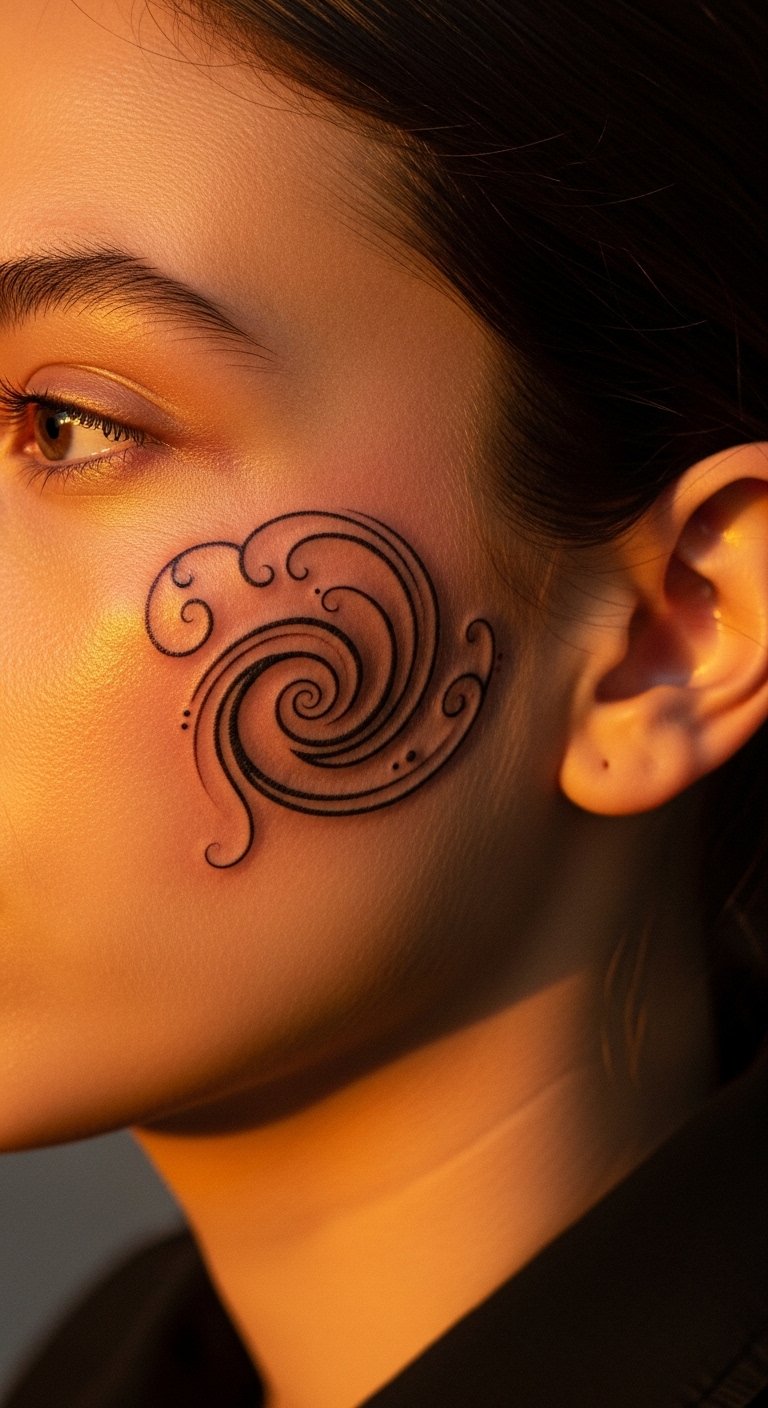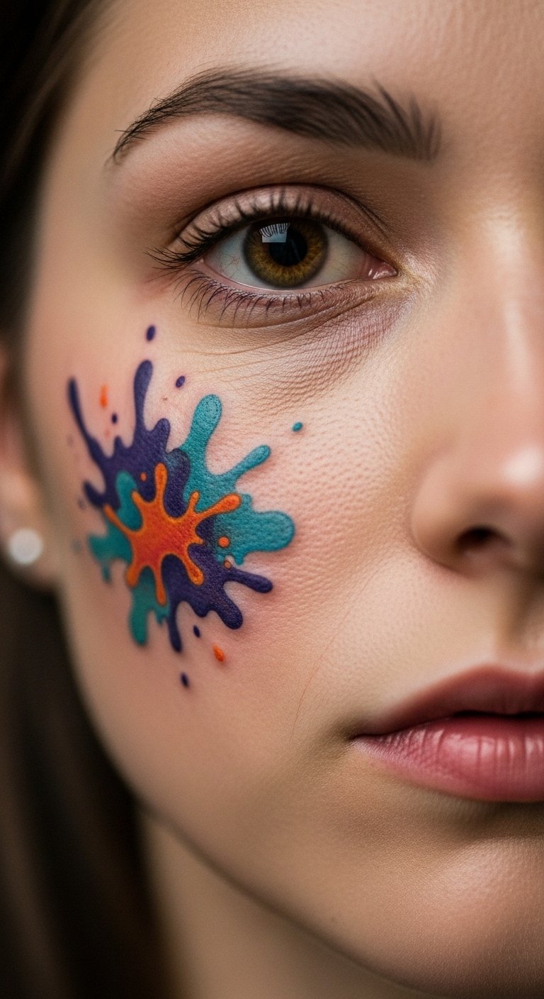 A cheek abstract blot tattoo blends colors. It expresses freely. Choose blots that surprise. Smear paints on paper to begin. This tests blends. For thrifty tips, use paint apps on your phone. Create blots. Seek out deal artists. DIY example: Dab paint on your cheek with a brush temporarily. See the abstract. Opt for one blot for costs. This design adds flair. Pair with creative outfits. Apply basic gels for care. They hold the shape. Wipe gently. It will spark joy. Experiment in artful photos.