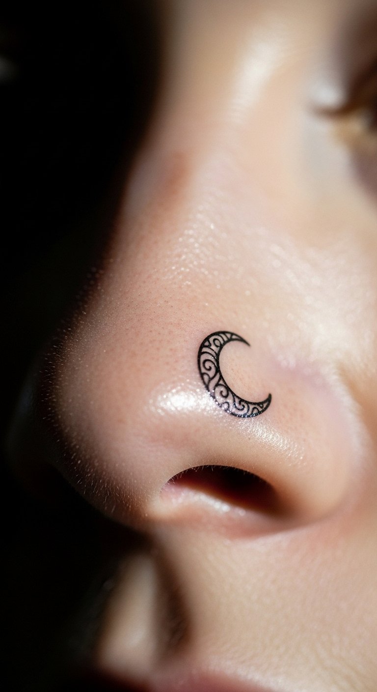 A nostril crescent moon tattoo captures mystery. It evokes the night. Select moon phases that speak to you. Trace on paper to begin. This refines the idea. For economical tips, find moon templates online for free. Print and practice. Seek out sale days at shops. DIY example: Place a temporary moon sticker near your nostril. Adjust for fit. Opt for thin crescents to save. This design accents your profile. Wear with themed clothes. Apply basic lotions for healing. They preserve the look. Clean with soft cloths. You’ll connect with it deeply. Capture in natural settings.