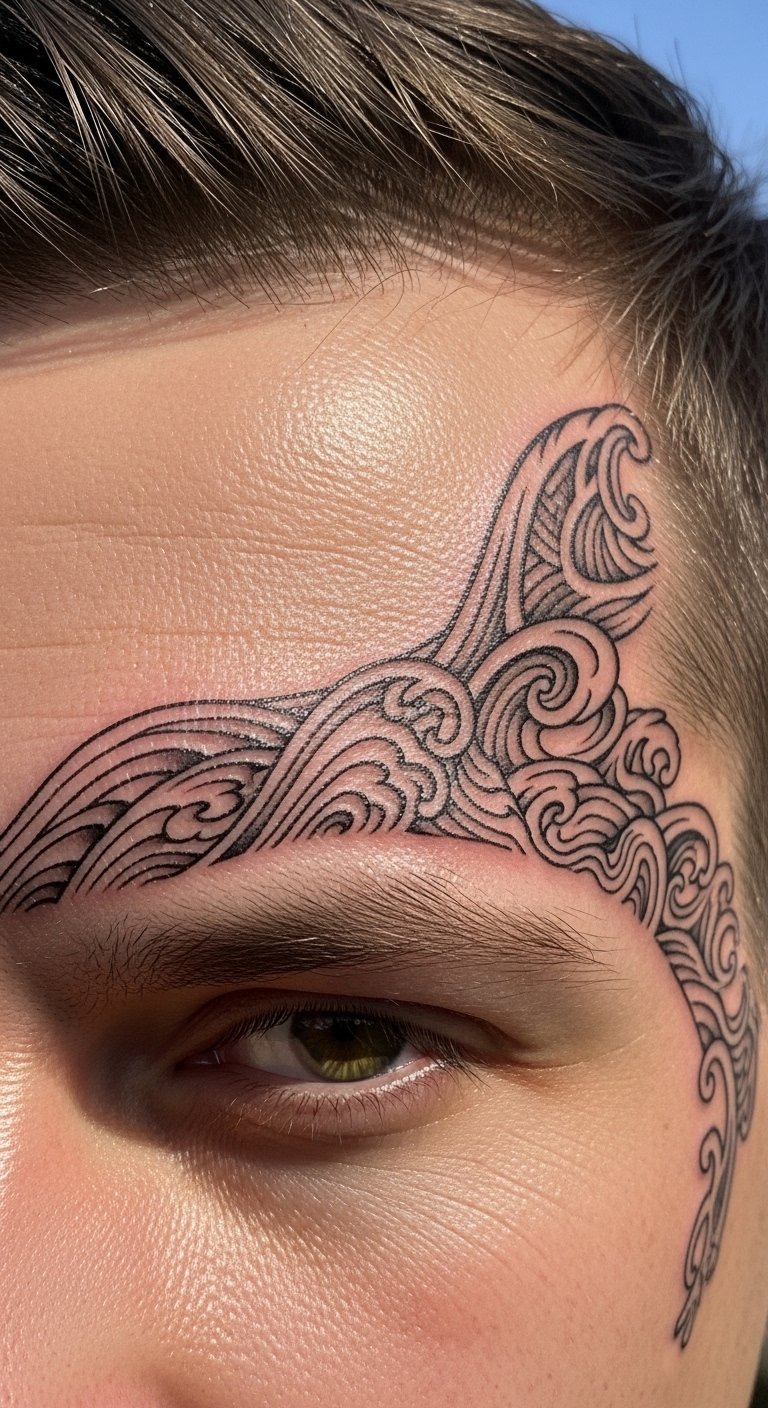 A temple wave pattern tattoo brings calm. It mimics the sea. Choose wave styles that relax you. Draw waves on sketches first. This tests the flow. For budget ways, use wave generators in free apps. Experiment freely. Find artists with online portfolios. DIY example: Draw waves with a pen on your temple area temporarily. See the movement. Keep patterns simple for costs. This tattoo enhances focus. Pair with water-inspired accessories. Use affordable salves for care. They maintain the design. Wipe gently each day. It will soothe your mind. Pose with water backgrounds.