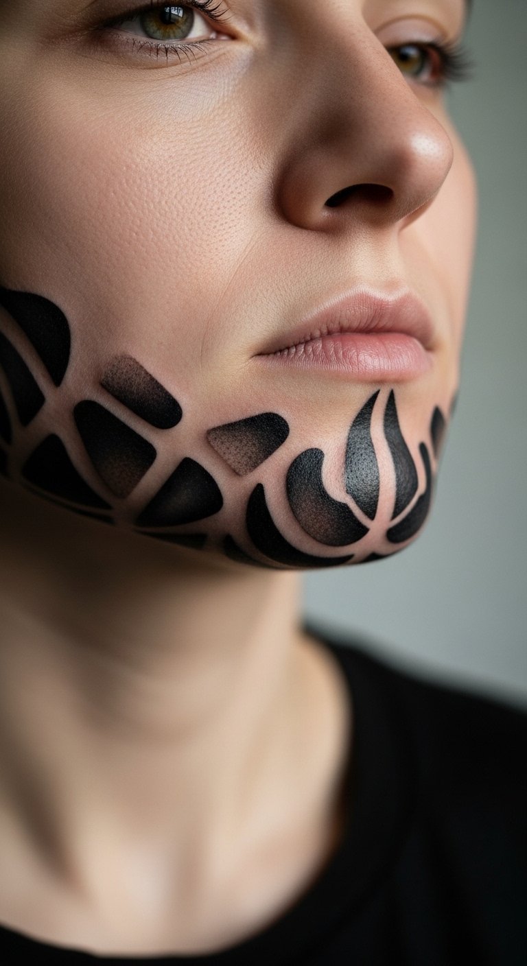 Jaw abstract shapes tattoo plays with forms. It sparks imagination. Select shapes that intrigue you. Sketch abstracts on notepads first. This sparks ideas. For cost cuts, source abstract shapes from public sites. Adapt quickly. Check for parlor discounts. DIY example: Cut abstract shapes from paper and hold to your jaw. See the effect. Choose basic forms for budgets. This tattoo defines your edge. Pair with artistic wear. Apply drugstore gels for care. They aid longevity. Rinse carefully. It will inspire daily. Try mirror angles.