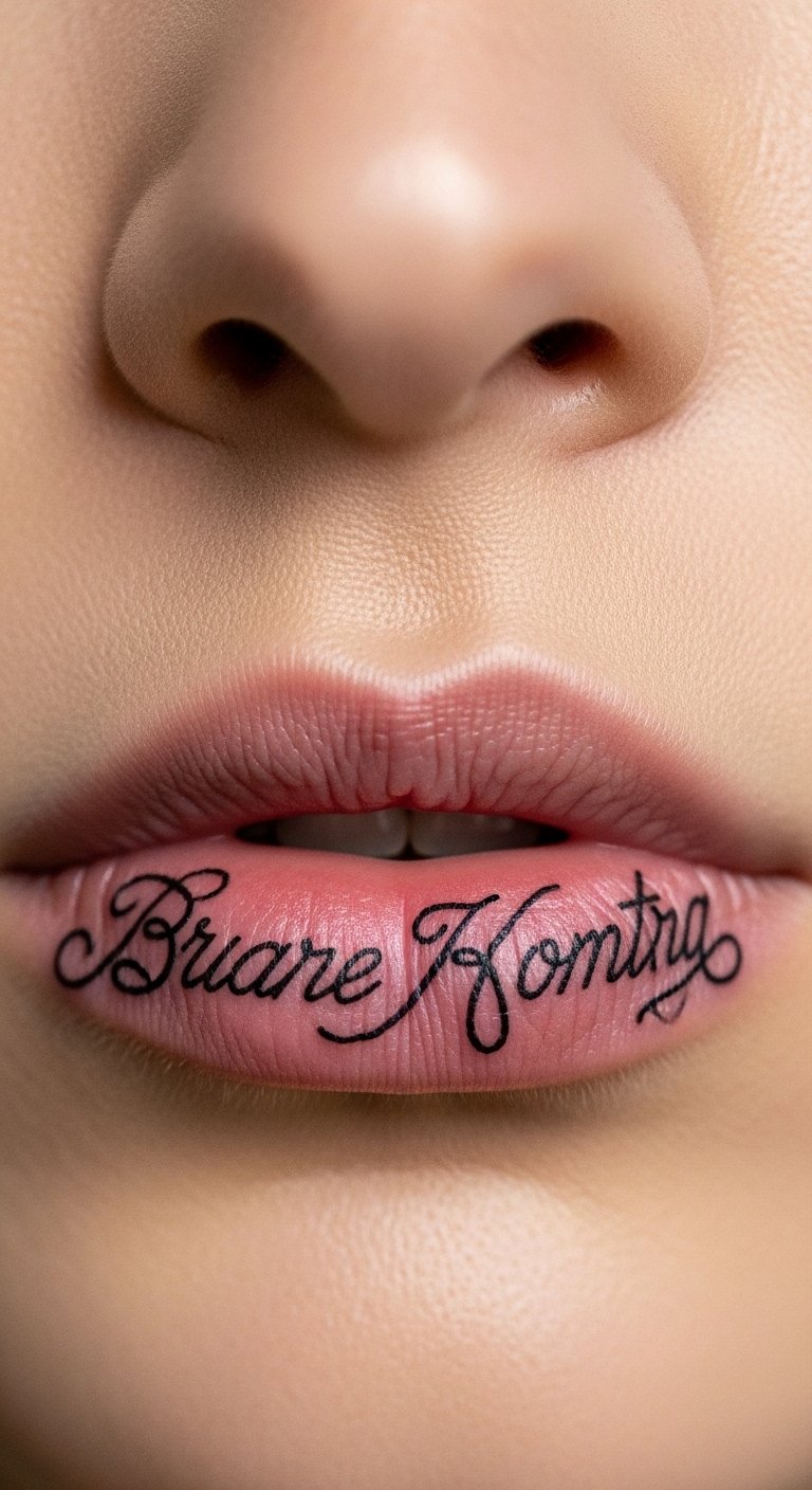 A lip side script tattoo shares words. It personalizes your message. Choose phrases that motivate. Practice writing on paper first. This perfects the script. For budget tips, use free font apps to design. Print options. Seek artists with script specials. DIY example: Write words with a fine pen near your lip temporarily. See the read. Go for short scripts to cut costs. This tattoo voices your story. Pair with meaningful jewelry. Use basic balms for care. They keep text sharp. Wipe daily. It will speak volumes. Pose for close-ups.