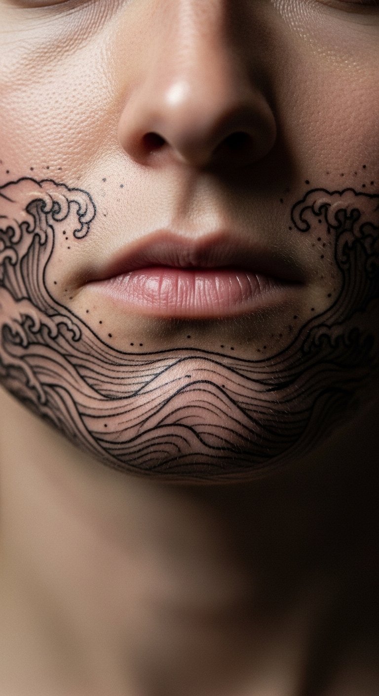 Chin wave lines tattoo creates waves. It suggests movement. Pick line patterns that energize. Draw waves on drafts first. This explores rhythm. For economical ways, generate waves in free software. Use them. Contact local pros for quotes. DIY example: Draw wave lines with a tool on your chin temporarily. See the wave. Choose flowing lines for savings. This tattoo adds dynamism. Pair with active wear. Use generic creams for care. They preserve lines. Gently clean daily. It will motivate you. Try action poses.