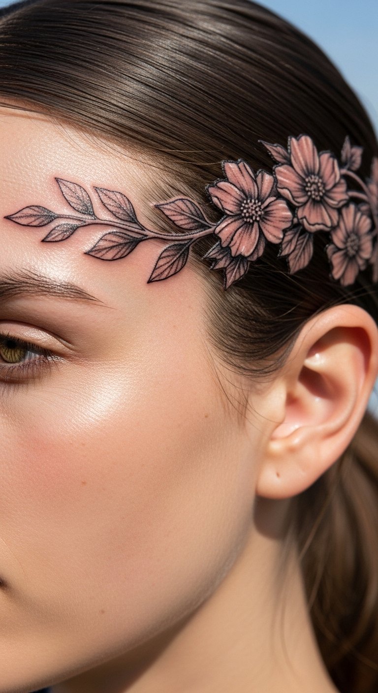 A temple floral vine tattoo grows your story. It connects elements. Decide on vine lengths that appeal. Sketch vines on paper initially. This builds the path. For budget hacks, find vine illustrations online for free. Adapt them. Look for vine experts at fairs. DIY example: Drape string like a vine on your temple temporarily. Test growth. Go for short vines to save. This design links your features. Wear with nature themes. Use affordable lotions for healing. They keep it vivid. Clean with care. You’ll grow with it. Capture in green settings.