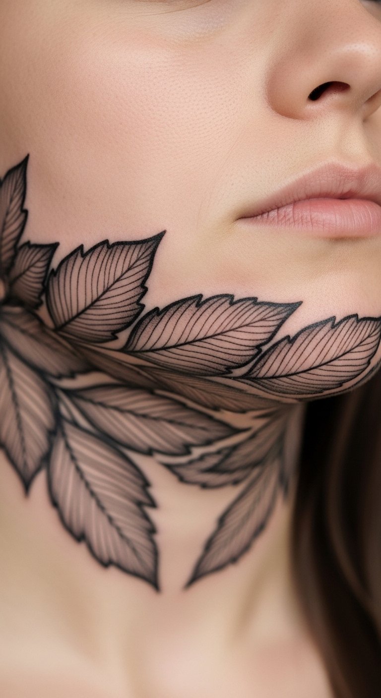 A jawline leaf pattern tattoo brings foliage. It represents growth. Select leaves that inspire. Draw leaves on sketches first. This captures essence. For saving money, download leaf templates online. Use them. Find artists with nature portfolios. DIY example: Press real leaves to your jaw and trace. Test the pattern. Choose few leaves for budgets. This design freshens your look. Wear with outdoor gear. Use common creams for healing. They maintain leaves. Clean daily. You’ll feel renewed. Pose with plants.