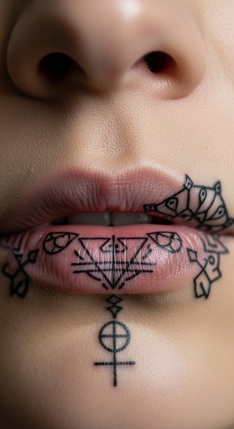 A lip corner symbol tattoo marks a spot. It signifies meaning. Choose symbols that resonate. Draw them on corners of paper. This positions accurately. For budget ideas, find symbol icons for free. Trace options. Visit shops with symbol deals. DIY example: Place a symbol sticker at your lip corner temporarily. Adjust fit. Opt for simple symbols for savings. This design points to stories. Wear with expressive lips. Apply basic ointments for healing. They protect the mark. Wipe daily. It will symbolize you. Capture close details.