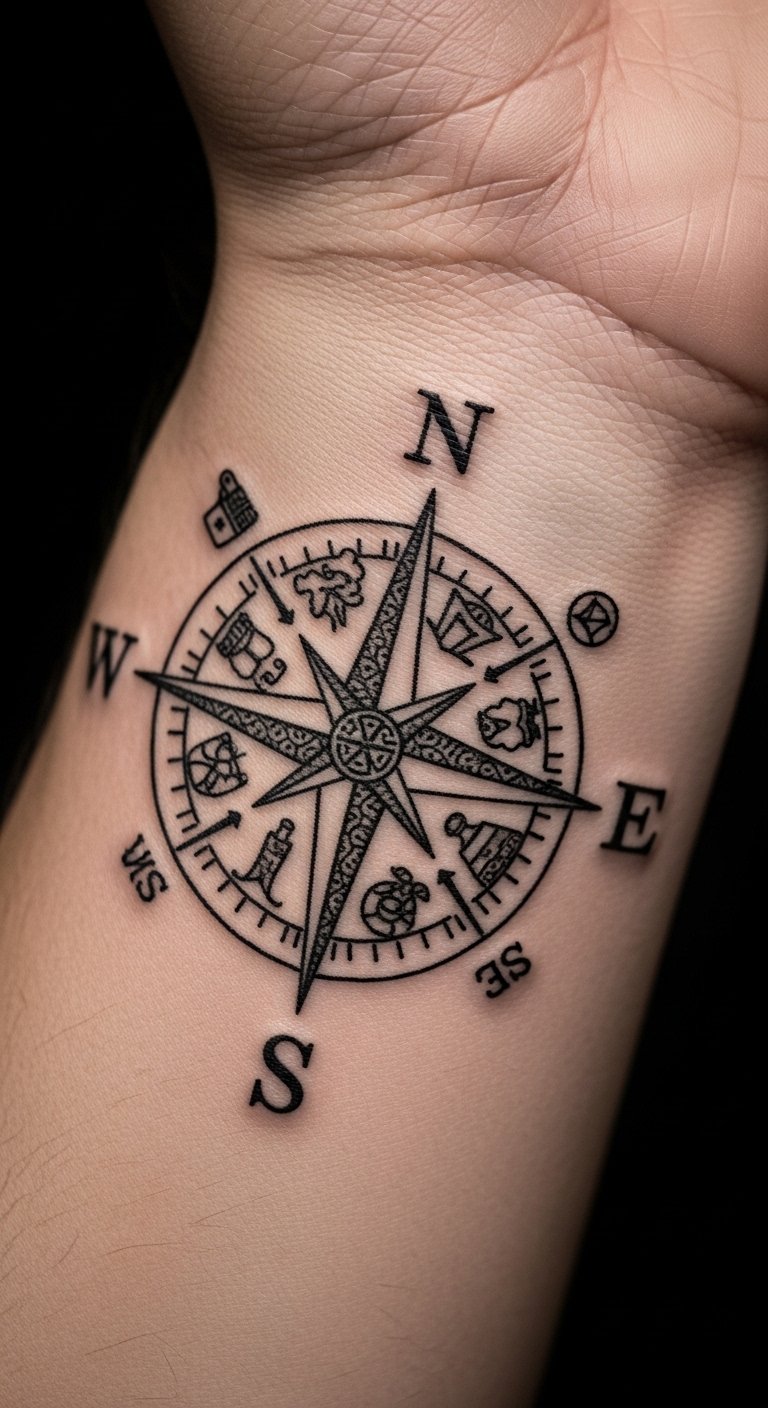 Use a compass to point to family direction. Draw a basic compass on paper and add simple symbols yourself. This cuts down on design fees. Put it on your wrist for everyday wear. Choose plain ink to stay budget-conscious. For instance, use a compass app on your phone to inspire the layout. It’s a practical way to show guidance. Test it with a temporary tattoo first. This design guides your story.
