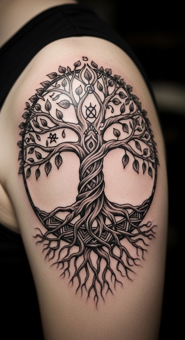 Create a tree of life for deep connections. Draw a circle with branches on paper to start. Position it on your shoulder for impact. Stick to shades for economy. Plan with household items. This motif shows growth easily. It’s a solid family symbol.