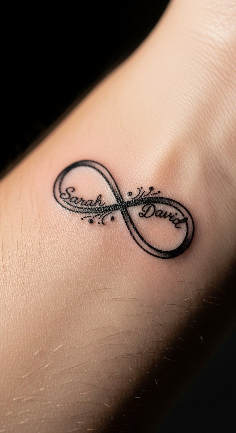 Loop an infinity with names for eternity. Write names along the shape at home. Put it on your wrist for visibility. Use simple lines to cut expenses. Sketch it multiple times. This design lasts forever. It’s a quick family link.