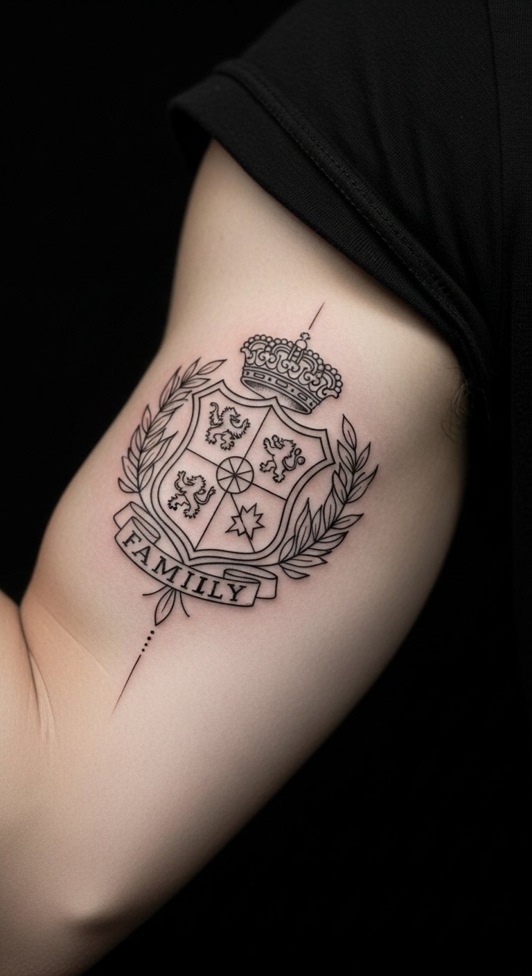 Outline a family crest in fine lines. Design it with free software. Position on your bicep. Keep it thin for cost. Sketch versions. This crest honors lineage. It’s a neat design.