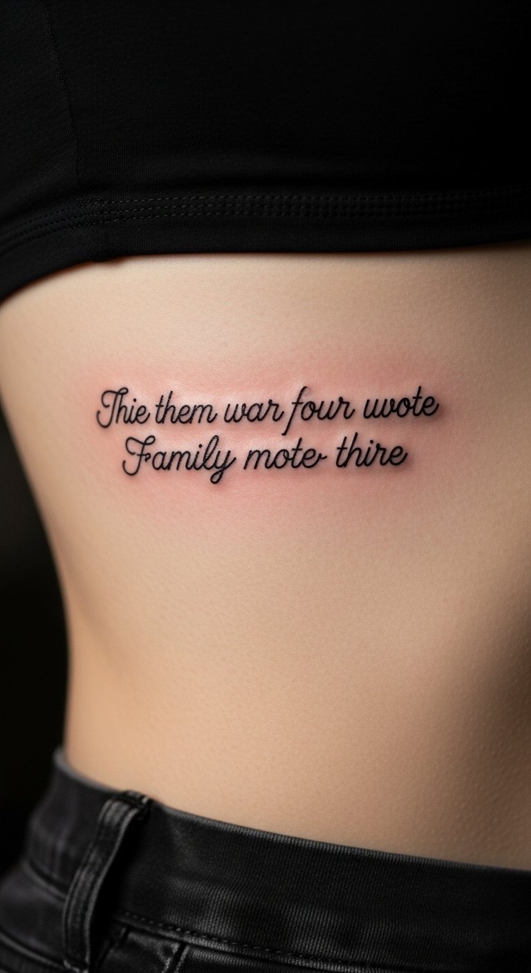 Add a motto quote in script. Write it out yourself. Place on your rib. Opt for plain style. Practice writing. This quote inspires daily. It’s a motivational step.