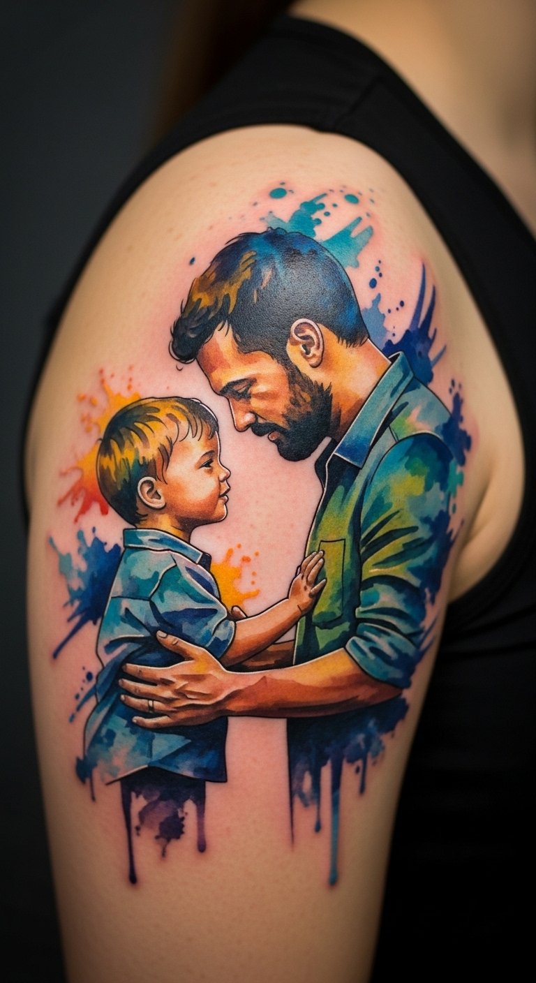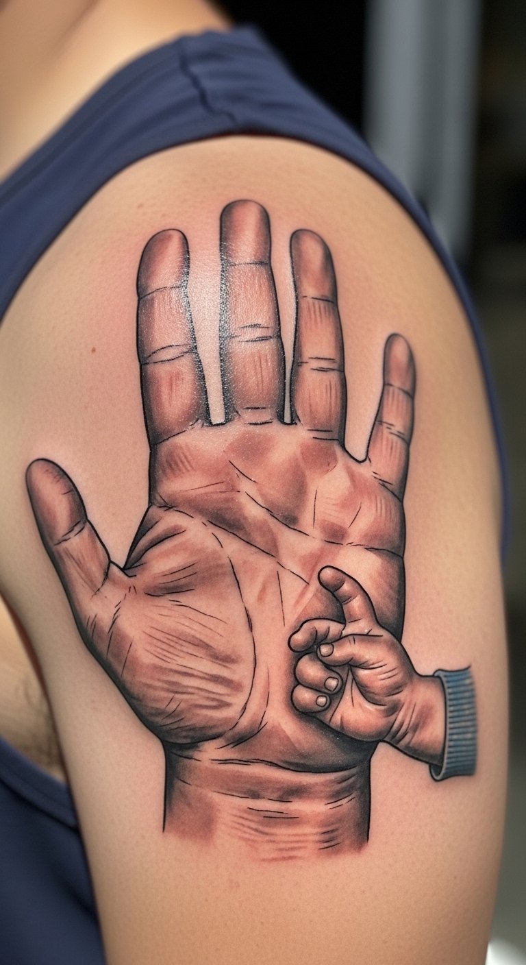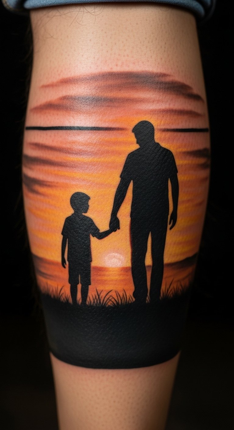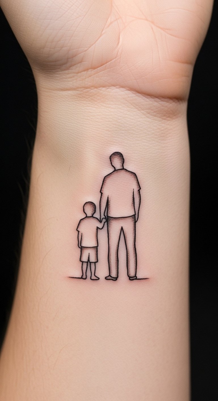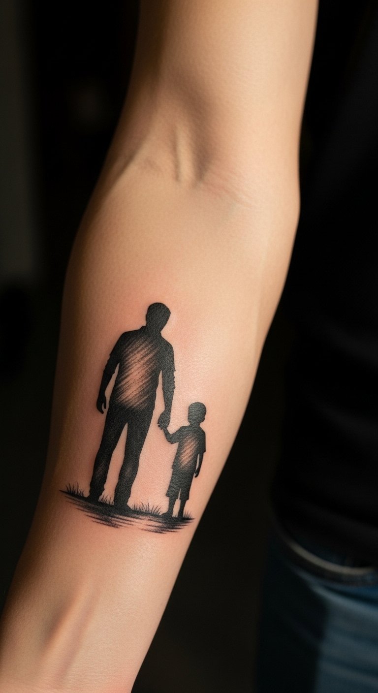 Think of the silhouette as a timeless choice. It shows a father and son hand in hand. This design fits any budget. Start with a sketch on paper to plan it out. Use free online tools to draw your own version before hitting the shop. Keep it small for less cost—say, on your wrist. A basic artist might charge $50 to $100 for a small one. Add a personal twist, like your child’s actual hand size. Break it down: trace a handprint at home for reference. This makes the tattoo meaningful without extra expense. Go for black ink to keep things simple and affordable. Pair it with everyday clothes so it doesn’t stand out too much. Remember, less ink means quicker healing. Try a temporary tattoo first to test the look. It’s an easy way to see if you like it. Focus on what matters: the bond it represents.